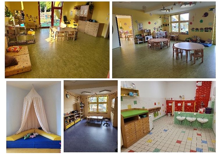 Unsere Einrichtung liegt mitten in Seelow und hat Platz für 104 Kinder auf zwei Etagen. Im Untergeschoss befinden sich unsere vier Gruppenräumen für die Kleinsten bis zum 3. Lebensjahr und die Sauna. Hier unten können sich die Kinder frei entfalten und werden in ihrer Selbstständigkeit gefördert. Dazu zählen unter anderem das An -und Ausziehen, auf die Toilette gehen, Essen mit Besteck, erste Fingerspiele und Lieder u.v.m.