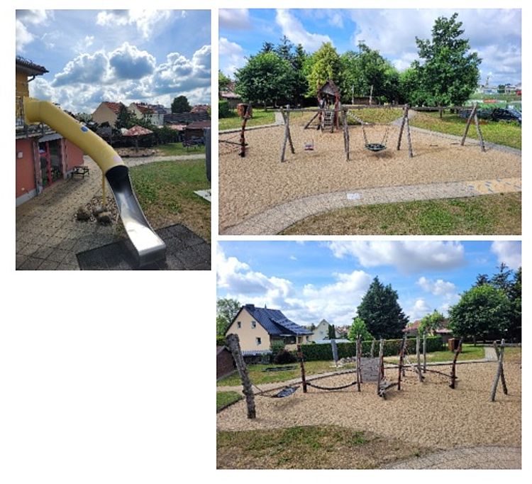 Unsere Außenanlage bietet mit 1200qm viel Platz zum Toben, Entdecken und Spaß haben. Ein großes Angebot an Klettergerüsten, Rutschen, Schaukeln und Sandkästen. Angelegt ist unser Spielplatz in einem teilweise hügeligem Gelände, um im Sommer der Fahrt mit Bobby Car, Roller und Co. den nötigen Spaß zu geben und im Winter genau dieses Gefälle für eine Rodelpartie zu
